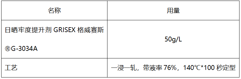 经过日晒牢度提升剂GRISEX格威赛斯®G-3034A处理后能提升1.5-2级左右,颜色有变浅,结果供参考,以第三方为准。