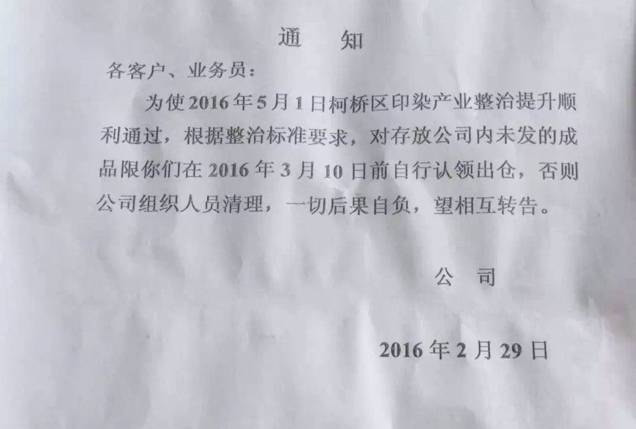 为使2016年5月1日柯桥区印染产业整治提升顺利通过,根据整治标准要求,对存放公司内未发的成品限你们在2016年3月10日前自行认领出仓,否则公司组织人员清理,一切后果自负。