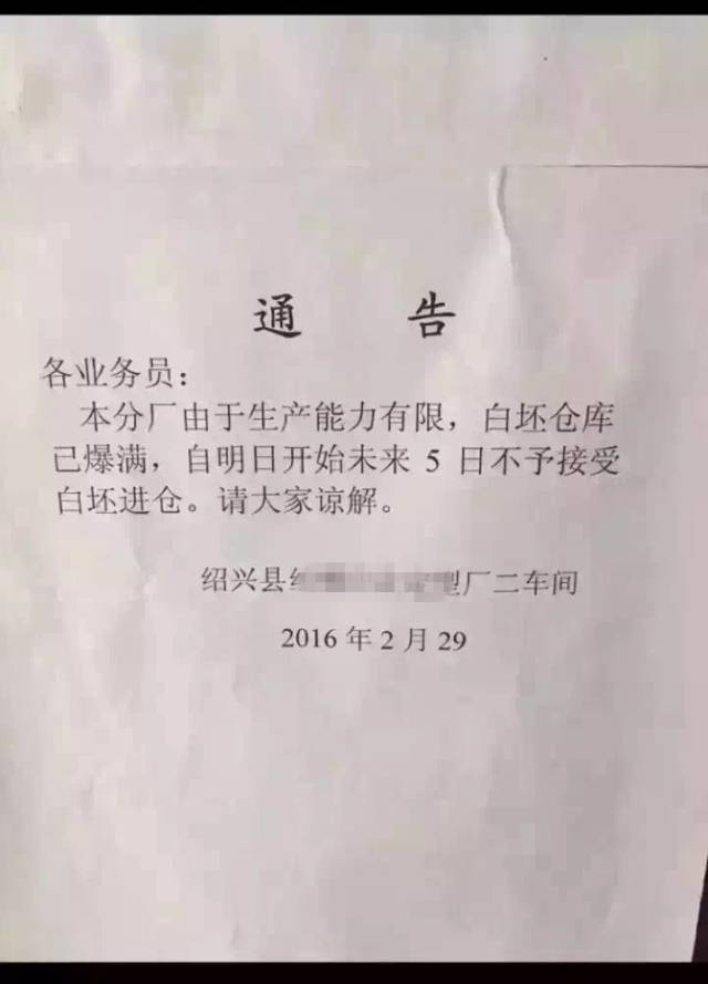 本分厂由于生产能力有限,白坯仓库已爆满,自明日开始未来5日不予接受白坯进仓。