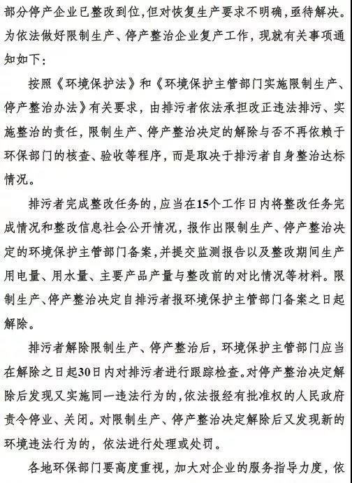 江苏省环保厅这份名为《关于依法做好限制生产、停产整治企业复产工作的通知》显示,按照《环境保护法》和《环境保护主管部门实施限制生产、 停产整治办法》有关要求,由排污者依法承担改正违法排污、实施整治的责任,限制生产、停产整治决定的解除与否不再依赖于环保部门的核查、验收等程序,而是取决于排污者自身整治达标情况。