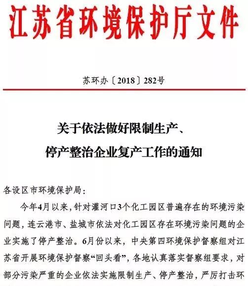 近日,江苏省环保厅下发通知,江苏连云港、盐城两地因环保整治而停产的化工园区企业,完成整改任务的企业将相关情况进行社会公示、并向有关环保部门提交材料备案后即可复产!停产企业复产不必再依赖于环保部门的核查、验收等程序!但若再犯将被责令关停!