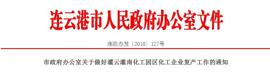 为深入落实《省政府办公厅关于印发全省沿海化工园区(集中区)整治工作方案的通知》(苏政办发〔2018〕46号)、《市政府办公室关于印发连云港市化工园区(集中区)整治工作方案的通知》(连政办发〔2018〕113号)文件精神,扎实开展化工园区整治,加快化工园区转型发展,现就做好两灌化工园区化工企业复产工作通知如下: