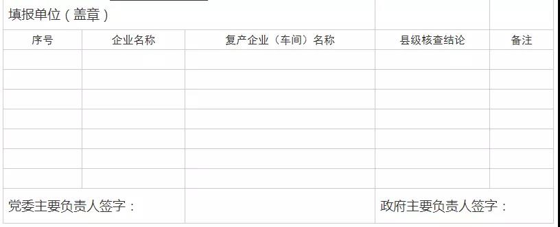 (一)县级核查。对提出复产申请的化工企业,县政府组织环保、安监、消防部门进行现场核查,核查结论为“同意复产”的,以县政府名义行文上报市政府,填写《化工企业复产申请汇总表(附件1)》,县党政主要负责人签字盖章;填写《化工企业复产核查表(附件2)》,县环保、安监、消防部门主要负责人签字盖章。