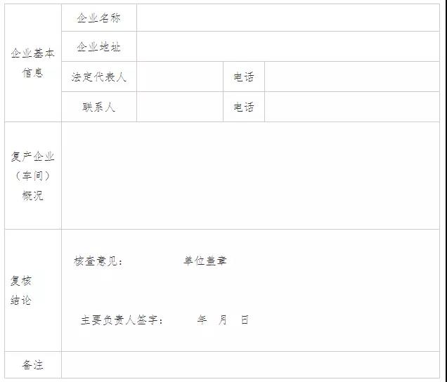 (二)市级部门复核。市政府收到复产申请报告后,由市经信委牵头,市环保、安监、消防等部门分别对拟复产的企业进行复核,明确形成“同意复产”或“不同意复产”的复核结论,填写《化工企业复产复核表(附件3)》,部门主要负责人签字盖章后送市经信委。