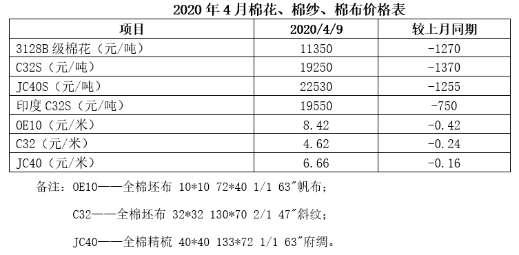 3月,在境外疫情快速蔓延等负面因素影响下,全球大宗商品进入下跌通道,郑棉期货大幅下跌,棉花现货价格月内最高跌幅超过2000元/吨,4月9日,国内3128B级棉花现货报价11350元/吨,纺企采购减少,市场零星成交,近期棉价维持低位震荡。棉纱市场3月上旬销售情况较好,下旬以来市场整体成交转淡,价格持续下跌,常规品种价格较上月同期下跌1300元/吨左右,企业降价出货意愿增强,实际成交多可商谈,高支纱市场相对较好,部分地区销售尚可。据了解,目前多数纺纱企业仍维持正常生产,纱线库存大多在1个月左右。