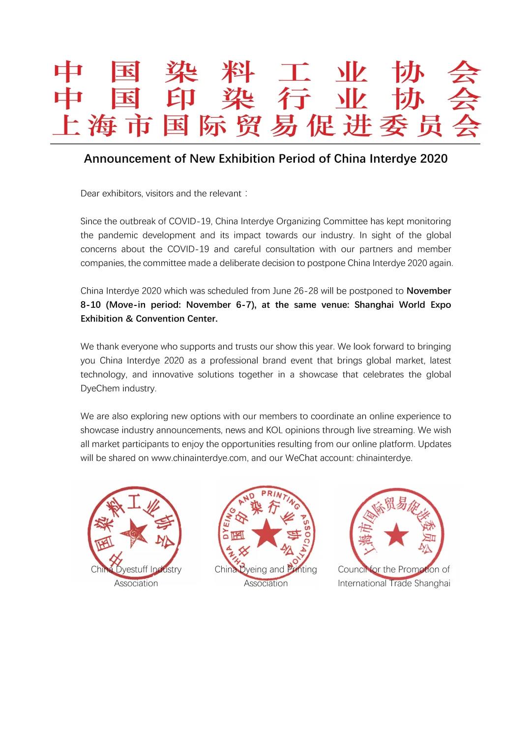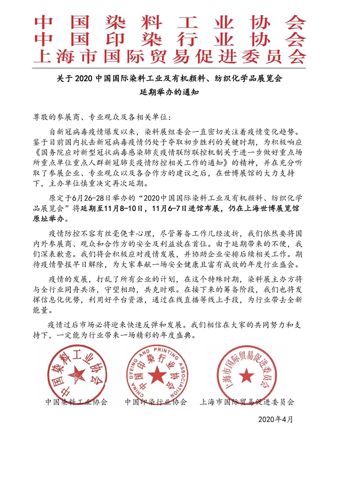 自新冠病毒疫情爆发以来,染料展组委会一直密切关注着疫情变化趋势。鉴于目前国内抗击新冠病毒疫情仍处于夺取初步胜利的关键时期,为积极响应《国务院应对新型冠状病毒感染肺炎疫情联防联控机制关于进一步做好重点场所重点单位重点人群新冠肺炎疫情防控相关工作的通知》的精神,并在充分听取了参展企业、专业观众以及各合作方的建议之后,在世博展馆的大力支持下,主办单位慎重决定再次延期。