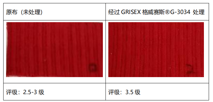 经过日晒牢度提升剂 GRISEX 格威赛斯®G-3034 处理后能提升 0.5-1 级左右。