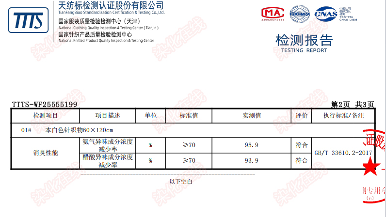 经过处理后的面料,送第三方检测机构测试,其中氨气异味的减少率超过95%,醋酸异味的减少率超过93%,均大幅超过国标70%的要求,消臭效果显著,符合客户要求!