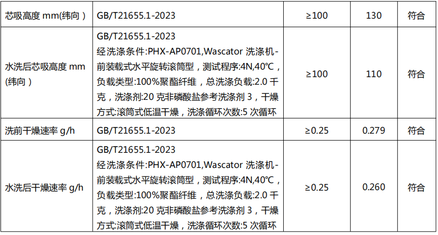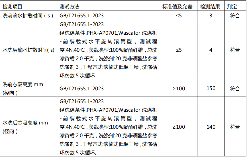 经过处理后的面料,各项指标均符合国标GB/T 21655.1-2023要求。