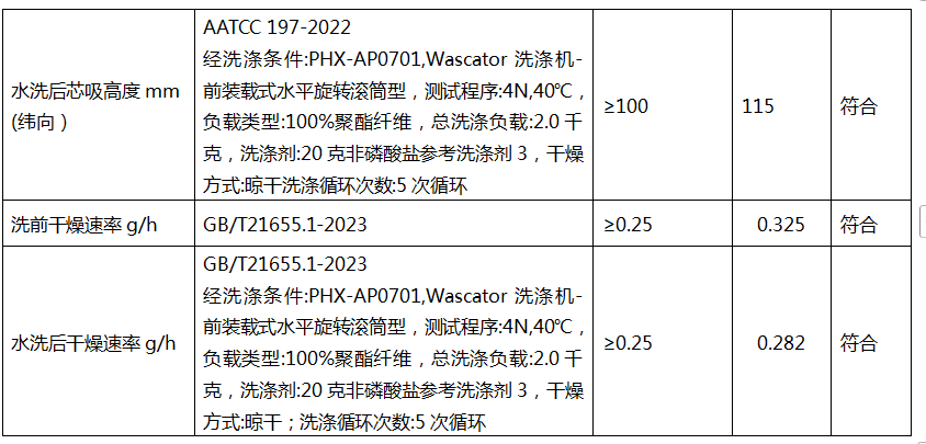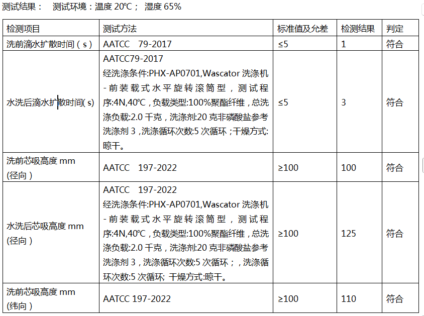 经过处理后的面料,各项指标均符合国标GB/T 21655.1-2023要求。其中吸水率在洗前洗后均≥100%;滴水扩散时间洗前1秒,洗后秒;芯吸高度洗前洗后>10mm以上;干燥速率洗钱洗后均>0.25g/h以上。