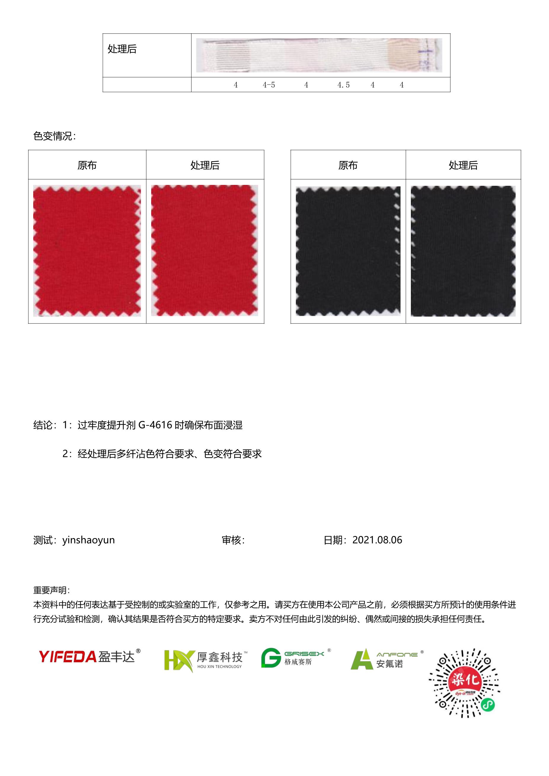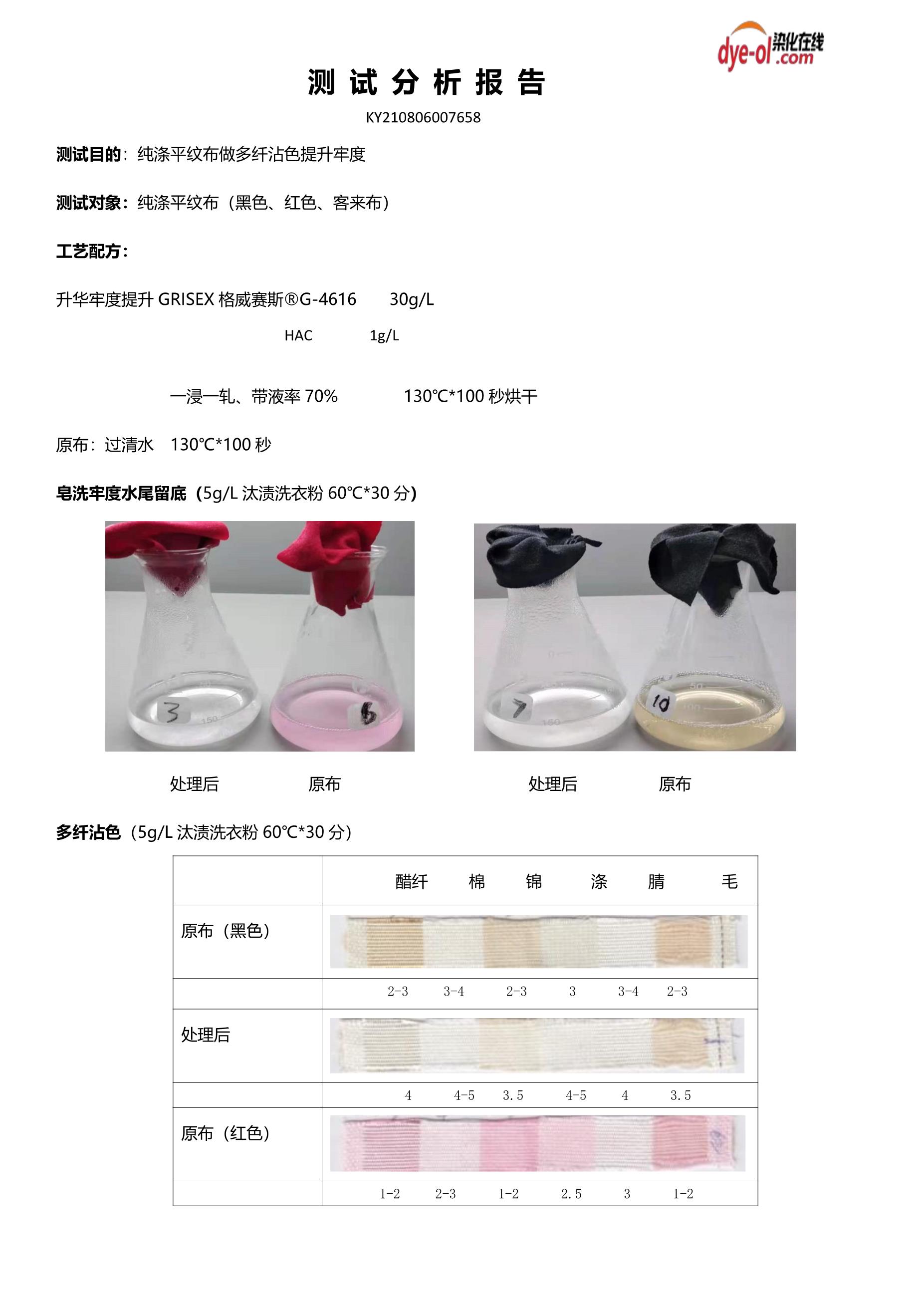 | 测试结论 | 后整理提升工艺、水尾变清 六纤沾色3级以上 |
