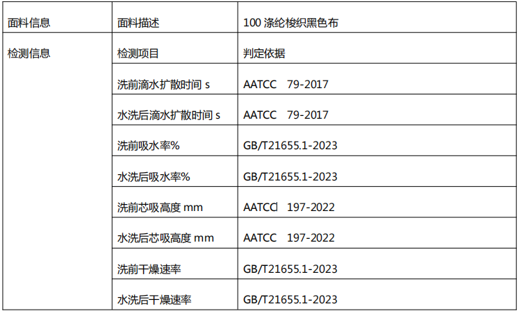 此方案是依据客户要求,开发100%涤纶梭织黑色布的吸湿速干功能。分别参考标准AATCC 79-2017、AATCC 197-2022、GB/T21655.1-2023三个标准,提升面料的洗前与洗后滴水扩散时间、吸水率、芯吸高度、干燥速率性能。通过筛选开发,我们为客户特制定此方案,供有相似需求的面料品牌企业参考。