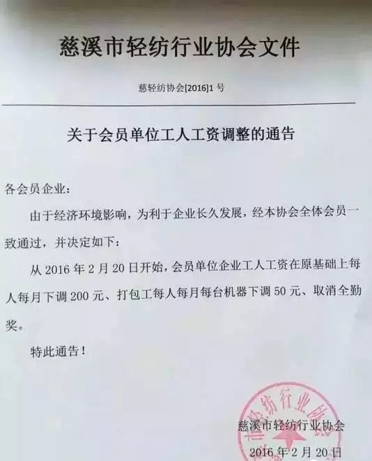 从2016年2月22日起,会员单位企业工人工资在原基础上每人每月下调200元、杂工每人每月每台机器下调50元、取消全勤奖等。