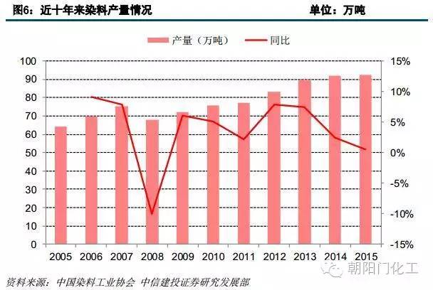 近年来,中国染料工业取得了高速发展,中国已经成为了世界上染料品种最全、产量最大的国家,中国正从染料产量大国向染料强国迈进。作为一个高研发投入、高环保投入、高利润率、高附加值的产业,过去5年,染料行业开启了淘汰落后产能、调整结构和绿色发展的转型之路,生产企业投入了更多的资金进行新产品、新工艺的研发,“三废”治理水平不断提高,行业进入了一个良性循环发展的轨道。中国目前生产的染料品种大约有 600 多种,涵盖各大染料类别,能满足国内绝大部分市场需求量。我国染料生产量较大的依次是分散染料、活性染料、硫化染料、还原染料、酸性染料等,分散染料、活性染料占据主导份额,约占整个染料行业的78%。我国染料生产量占主导份额的分散染料和活性染料产能集中度高,分散染料CR3约为71%,活性染料CR5约为67%,呈现出寡头垄断的局面。由于2011年以来染料行业开启了淘汰落后产能、调整结构和绿色发展的转型之路,我国染料生产企业个数呈下降趋势。截至2015年10月,我国染料制造行业企业单位数为325家。同时,我国染料行业企业分布的区域性明显,国内染料生产企业主要分布在江浙地区。近十年来我国染料行业处于稳步发展的状态,虽然近几年由于淘汰落后产能以及调整行业结构,染料生产企业个数有所减少,但通过激烈的竞争留存下来的优质企业仍在不断成长。随着供给进一步收缩,染料产量增速也在逐渐放缓。