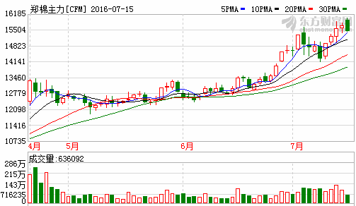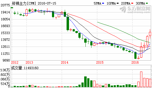 本周国内外棉花期货步步高升,郑棉期货强势上攻,其中1609主力合约周一较前一交易日大涨450元/吨,曾一度冲至15630元/吨涨停位后打开,周四最高位至15580元/吨,上涨205元/吨,市场仍处高位震荡之中。7月13日,郑棉CF1701合约更是瞬间冲破了16000元/吨大关,7月15日再创16060元/吨新高。