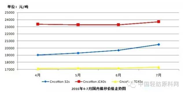 如上图所示,4-7月份国内棉纱价格有所上涨,其中C32S涨幅最大,前后价差在1000元/吨以上,同期棉花价差则达到了2000元/吨以上,而郑棉涨幅更是从10000元/吨左右的低位升至15000元/吨以上。棉纱价格涨幅明显低于棉花,纺企利润受到了挤压。