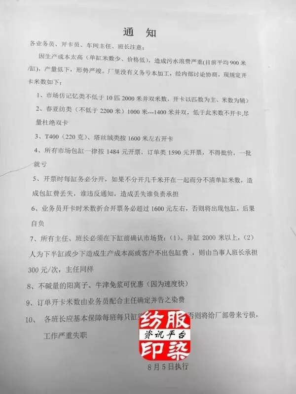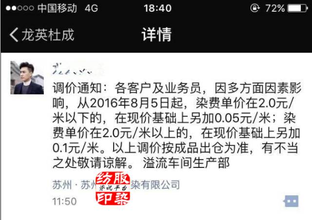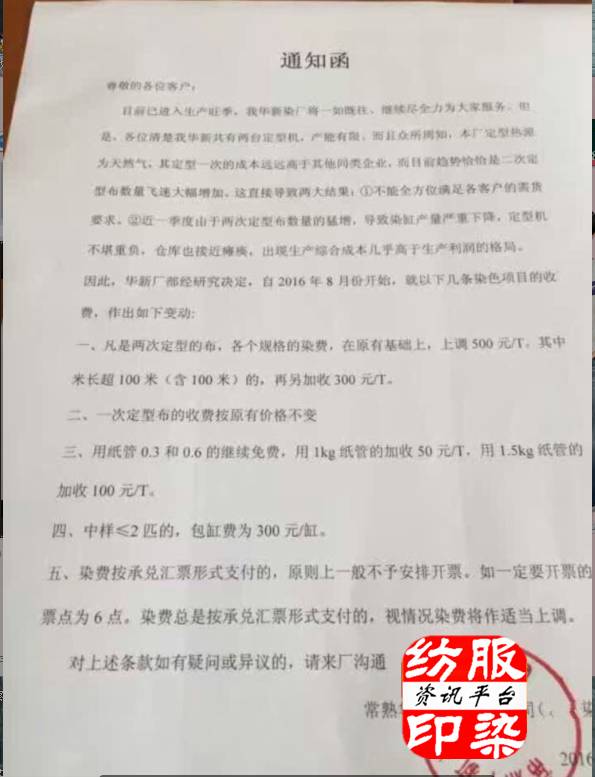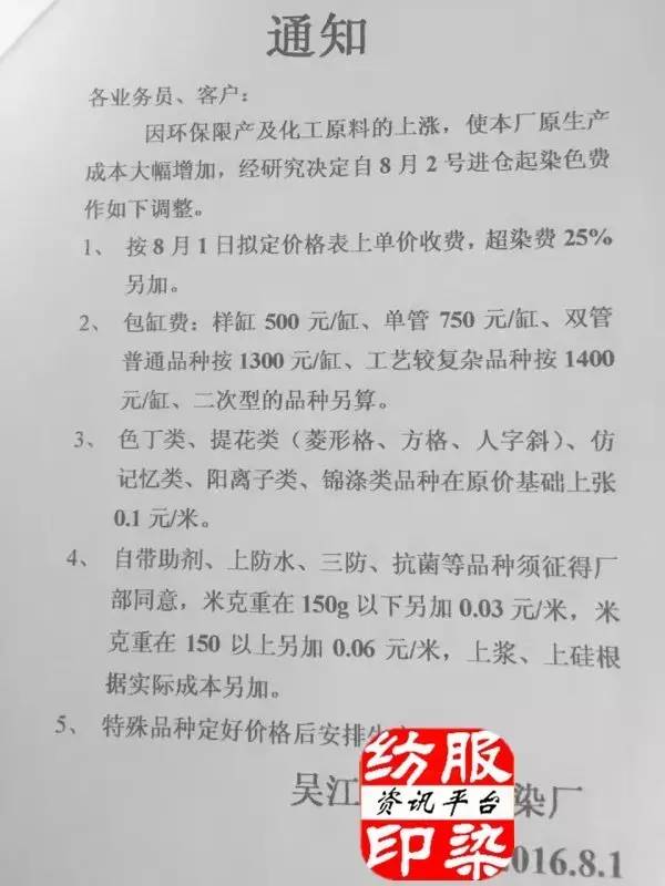 从2016年8月5日起:染费单价在2.0元/米以下的,在现价基础上另加0.05元/米,染费在单价2.0元/米以上的,在现价基础上另加0.1元/米……