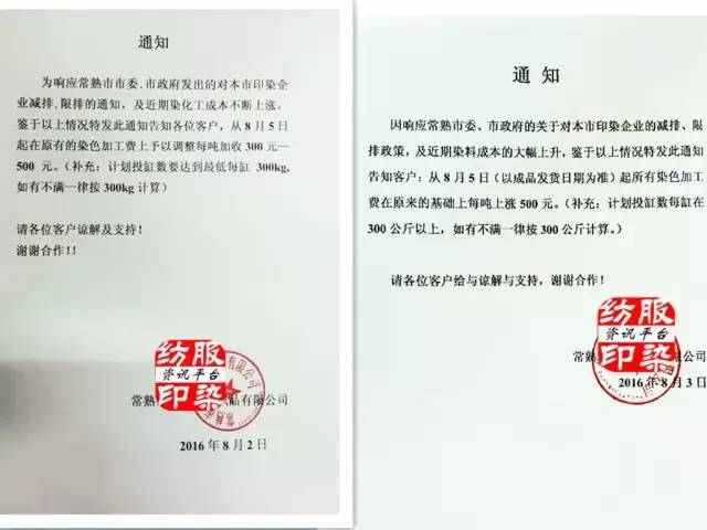 为响应常熟市市委,市政府发出的对本市印染企业减排,限排的通知,及近期染化工成本不断上涨,鉴于以上情况特发此通知告知各位客户,从8月5日起在原有的染色加工费予以每吨加收300元---500元。(补充:计划投缸数要达到最低每缸300KG,如有不满一律按300KG计算)