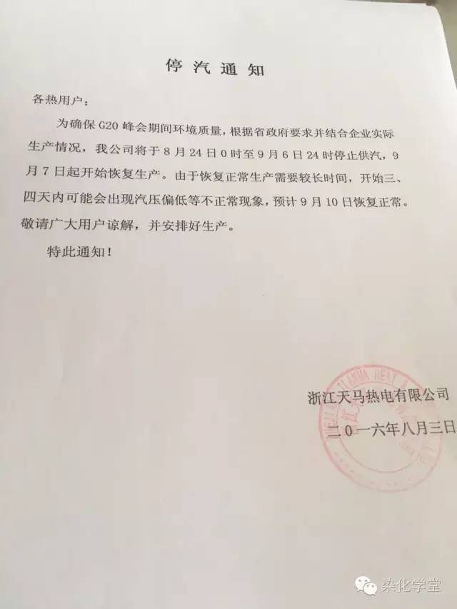 染化学堂大师群粉丝爆料:浙江天马热电有限公司将于8月24日0时至9月6日24时停止供汽,总计停汽14天。至少涉及浙江省36家印染企业。
