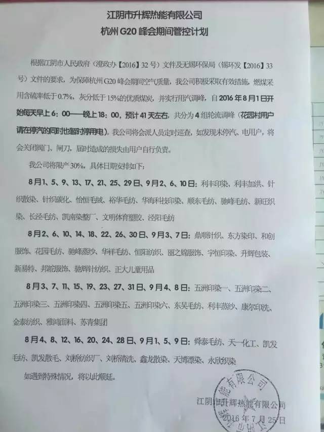 为保障杭州G20峰会期间空气质量,我公司积极采取有效措施,燃煤采用含硫率低于0.7%,灰分低于15%的优质煤炭,并实行用汽调峰,自2016年8月1日开始每天早上6:00-晚上18:00,预计41天左右,共分为4组轮流调峰。我公司将会派人员定时巡查,如发现未停汽、电用户,将会关闭阀门、闸刀,届时造成的损失由用户自行负责。