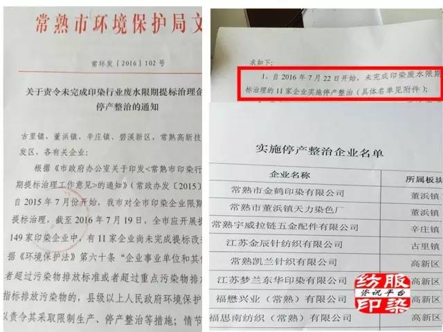 自2015年7月份开始,常熟市对全市印染企业限期提标治理,截至2016年7月19日,全市应开展提升治理149家印染企业中,有11家企业尚未完成提标改造。自2016年7月22日开始,未完成印染废水限期提标治理的11家企业实施停产整治!