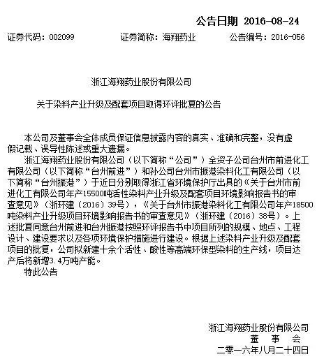 染料产业升级及配套项目获得环评批复: