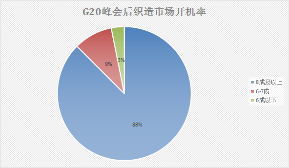 在一项针对G20后市场织机开机率的调查中显示,开机率预期恢复在8成以上的厂家占据完全主导地位,也有近10%左右的厂家预期负荷集中至6-7成水平,仅有不到5%的织造厂家认为开工可能出现6成及以下的情况。