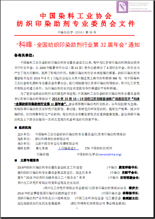 中国染料工业协会纺织印染助剂专业委员会成立以来,每年与江苏省印染助剂情报站联合 召开行业年会,从 2008 年签署合作协议(第 24 届)至今已经举办了 8 届行业年会。在行业内 产生了很大的影响,发挥了积极的作用。根据印染助剂行业未来发展的需要,纺织印染助剂专 委会秘书处自 2016 年 8 月 1 日起办公地址从常州搬迁至上海市共和新路 966 号,与中国染料 工业协会有机颜料专业委员会合署办公。我们将继续与江苏省印染助剂情报站、常州化工研究 所有限公司通力合作,为印染助剂行业的技术交流与合作搭建好平台和桥梁。