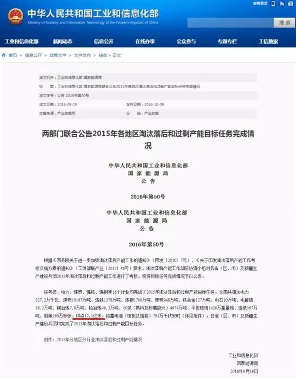 根据《国务院关于进一步加强淘汰落后产能工作的通知》(国发〔2010〕7号)、《关于印发淘汰落后产能工作考核实施方案的通知》(工信部联产业〔2011〕46号)要求,淘汰落后产能工作部际协调小组对各省(区、市)及新疆生产建设兵团2015年淘汰落后和过剩产能工作进行了考核,现将目标任务完成情况予以公告。