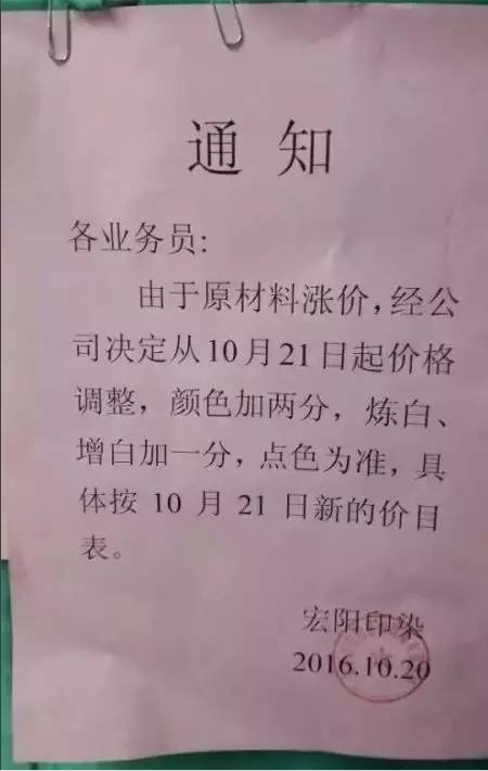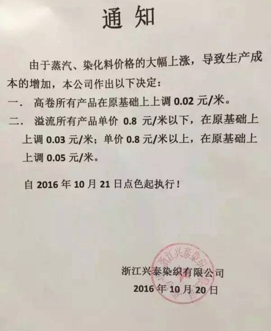 尊敬的客户,因近期以来煤,助剂,化工,色粉等一直在涨价,不负重堪。从2016年11月起所有普通染色均涨到3.5元/斤(不含定型),水溶与漂白每斤上涨0.2元。