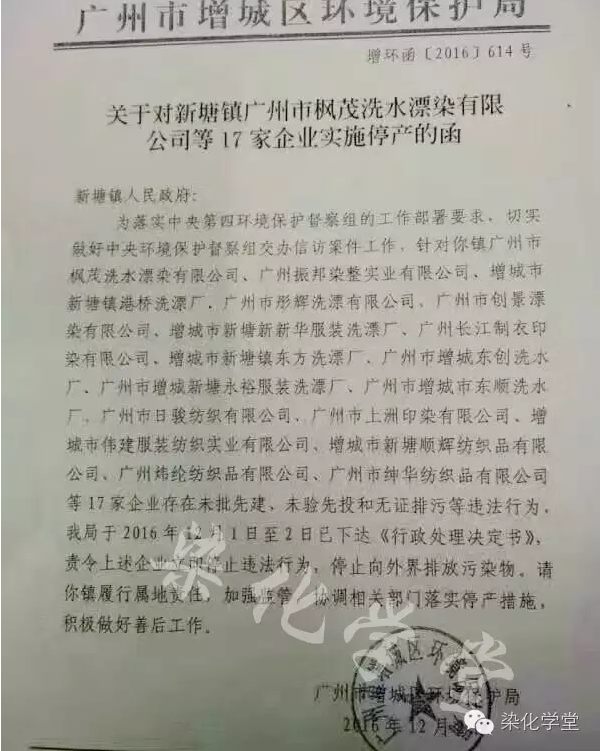 现广州市增城区环境保护局通报了(关于对新塘镇广州市枫茂洗水漂染有限公司等17家企业实施停产的函)