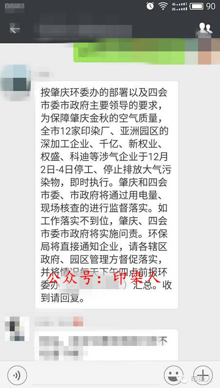 按肇庆环委办的部署以及四会市委市政府主要领导的要求,为保障肇庆金秋的空气质量,全市12家印染厂、亚洲园区的深加工企业、千亿、新权业、权盛、科迪等涉气企业于12月2日-4日停工、停止排放大气污染物,即时执行。肇庆和四会市委、市政府将通过用电量、现场核查的进行监督落实。