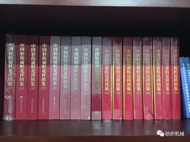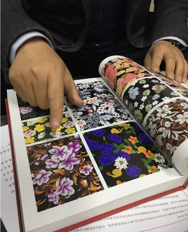 陈顺林向调研组展示公司自主开发的“中国轻纺面料花样图集”每年一本,目前已设计出版花型图集22本,每本内含4000多花型