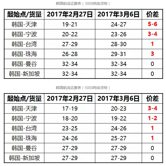 韩国至中国海运费上调,但韩国至曼谷、韩国至新加坡等周边国家运费暂无明显波动。