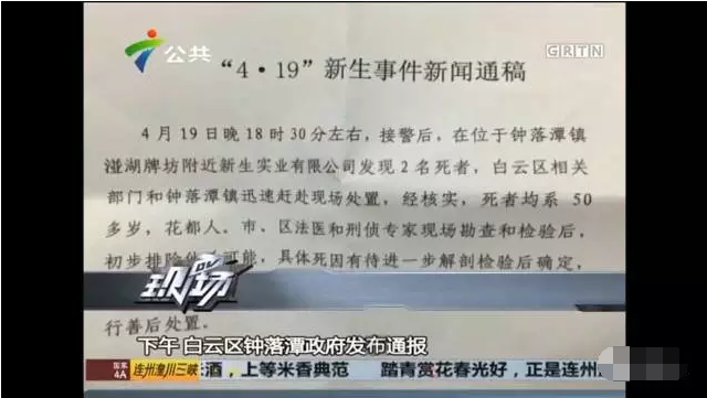 4月19日晚18时30分左右,接警后,在位于钟落潭附近新生实业有限公司发现2名死者,白云区相关部门和钟落潭正迅速赶赴现场处置。