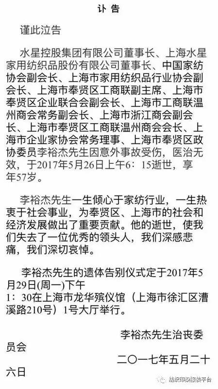 国内知名家纺企业水星家用纺织品股份有限公司董事长李裕杰因意外摔伤,医治无效,于昨天(26日)上午去世,享年57岁。
