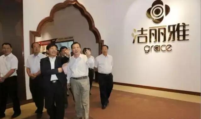2016年7月,新疆自治区党委副书记、兵团党委书记等赴洁丽雅新疆新越丝路有限公司考察调研。洁丽雅集团董事局主席石昌佳、洁丽雅新疆公司总经理夏敬永等陪同。