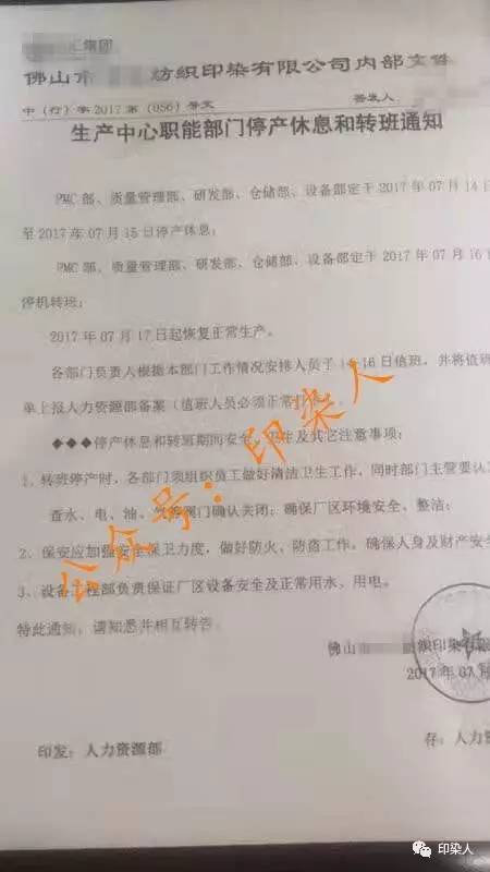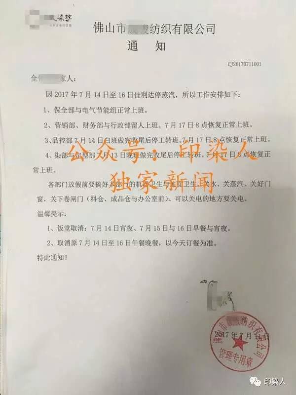 广东印染聚集区也开始闹心:从印染人获悉,广东印染集控地三水大塘工业园所有印染企业将在在2017年7月14号上午8:00至2017年7月17号上午8:00停工3天!