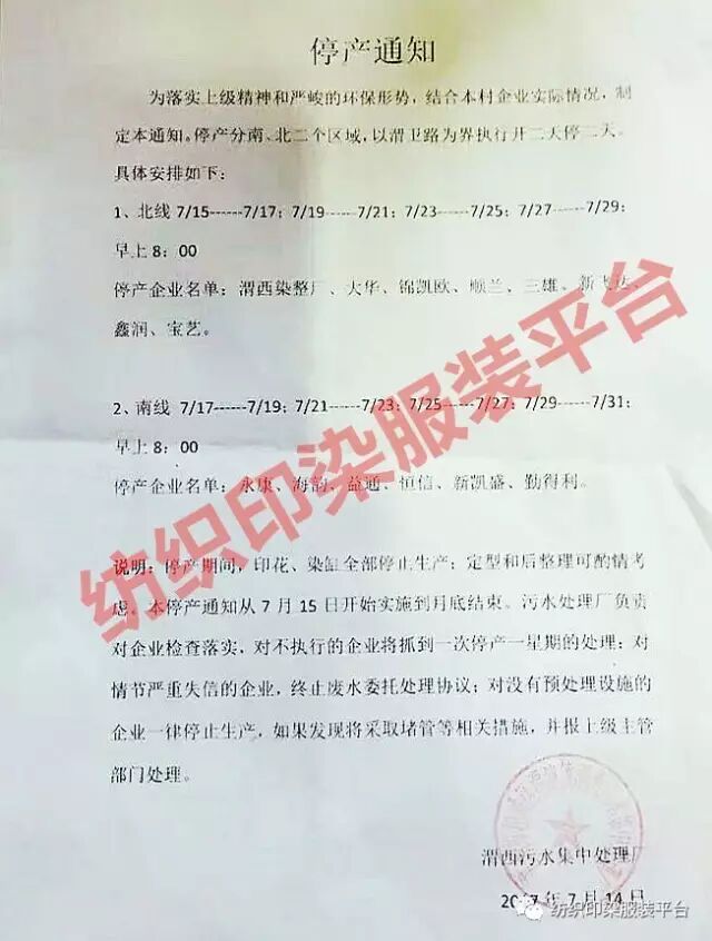 知。停产分南,北两个区域,以渭卫路为界执行开二天停二天。