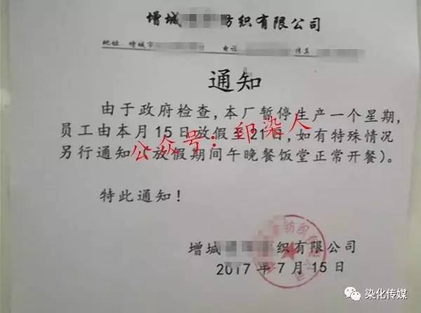 ▼近日,广州增城某印染企业发出内部通知,在通知中表示,由于政府检查,本厂暂停生产一个星期,员工由本月15号放假至21号,如有特殊情况另行通知。