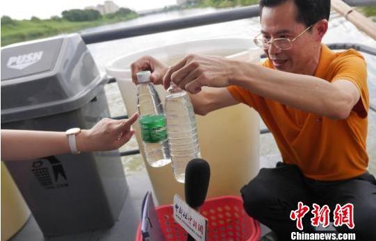 普宁环保部门工作人员向记者展示练江水与纯净水的对比。 陈启任 摄