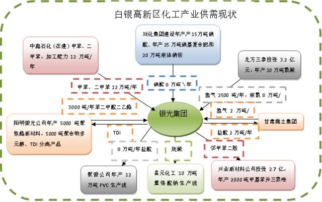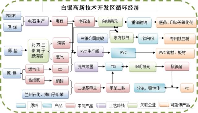 3.白银高新技术开发区光气化产品产业园。积极引入航天工程公司粉煤气化制氢项目建设气体岛,给园区企业供应具有竞争力的工业合成气体和公用工程气体,激活刘化集团公司、甘肃银光公司生产运营,补强光气化产业链。以甘肃银光公司为龙头,整合电石资源,构建电石、烧碱、光气化系列产品、PVC循环产业链,提升异氰酸酯等光气化产品竞争力。协调兰州石化公司、独山子石化公司甲苯原料,推进18万吨TDI扩建工程,建立以甘肃银光公司为核心企业的特色精细化工产业群。以甘肃东方钛业公司为龙头,充分利用白银市冶炼酸、电石渣等废副产物和其它化工原辅材料,形成企业间产品互为原料、内部废弃物外部循环利用的化工循环产业链,延伸开发高性能、高附加值、专用性强的钛白粉产品,2020年钛白粉产能达到20万吨以上。