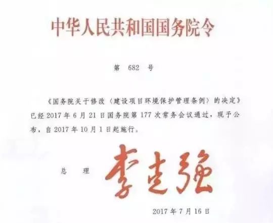 7月16日,国务院总理李克强签署第682号国务院令,公布《国务院关于修改〈建设项目环境保护管理条例〉的决定》,自2017年10月1日起施行。