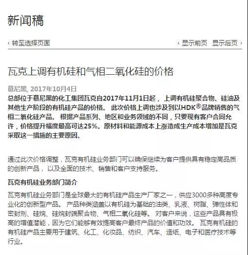 瓦克官网显示:瓦克自2017年11月1日起,上调有机硅聚合物、硅油及其他生产阶段的有机硅产品的价格。 此次价格上调也涉及到以HDK®品牌销售的气相二氧化硅产品。 根据产品系列、地区和业务领域的不同,只要现有客户合同允许,价格提升幅度最高可达25%。