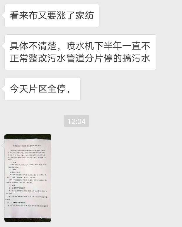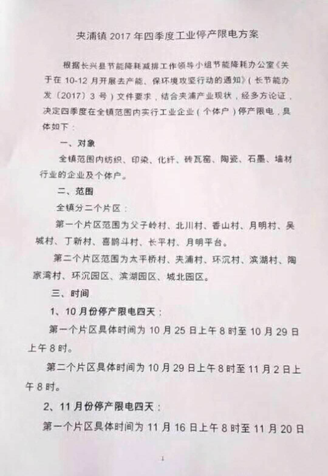 近日,长兴地区纺织、化纤等行业关于10-12月份限产的事件在行业内引起广泛关注,昨日,有业内人士透露:作为长兴地区纺织企业最为集中的夹浦镇,多家企业已经陆续收到了一份“四季度停产限电方案”。