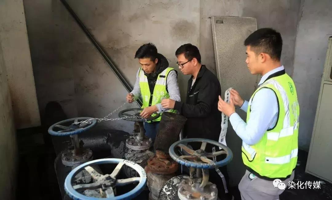环保执法人员分别对企业厂房内的蒸汽管阀、污水排放管进行关闭上锁并张贴封条。