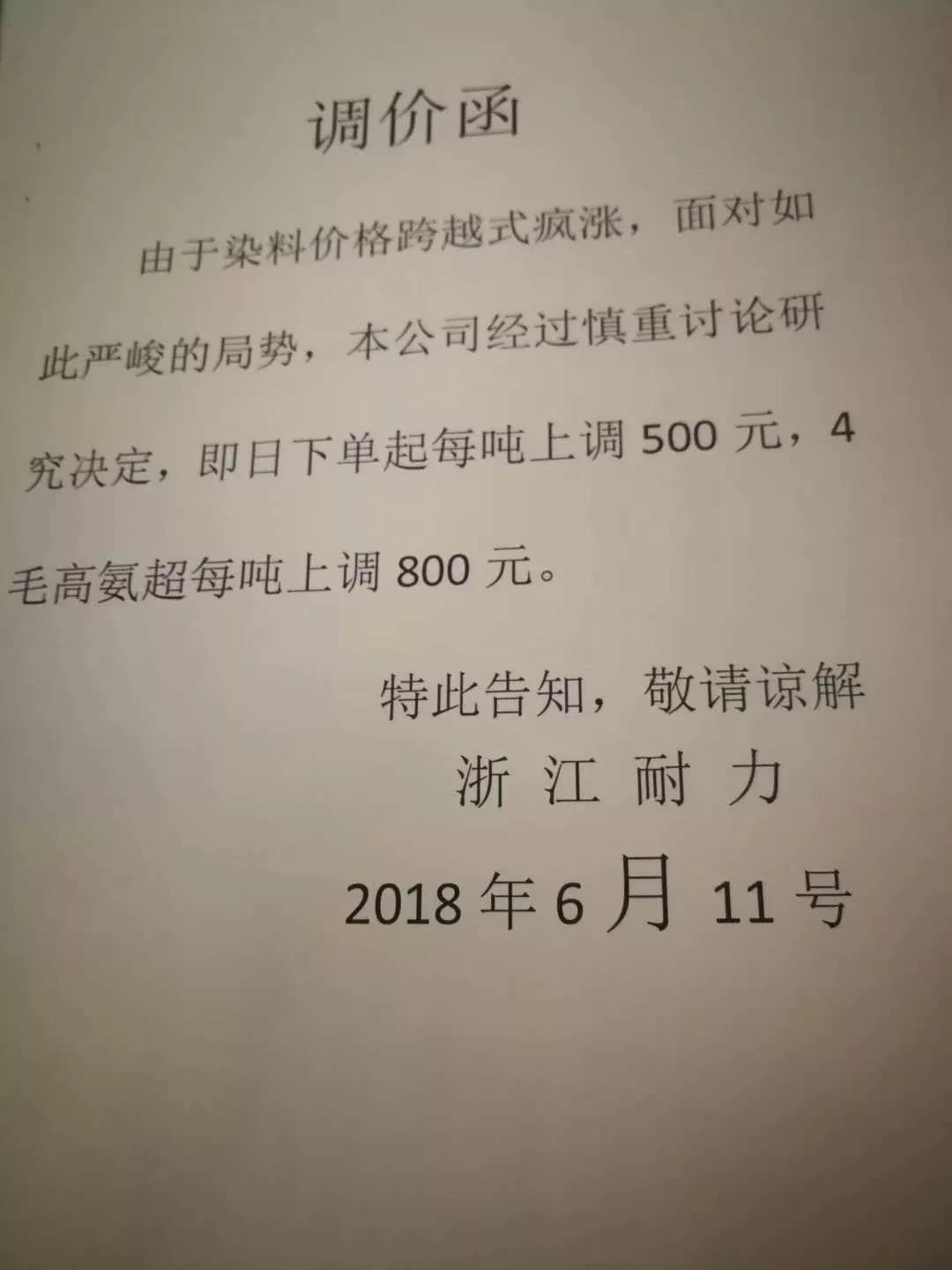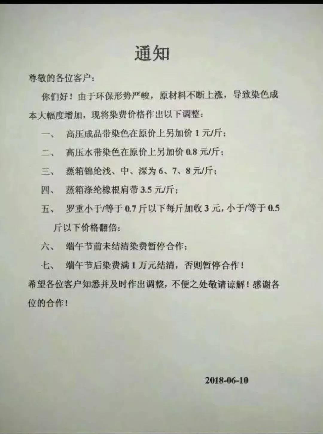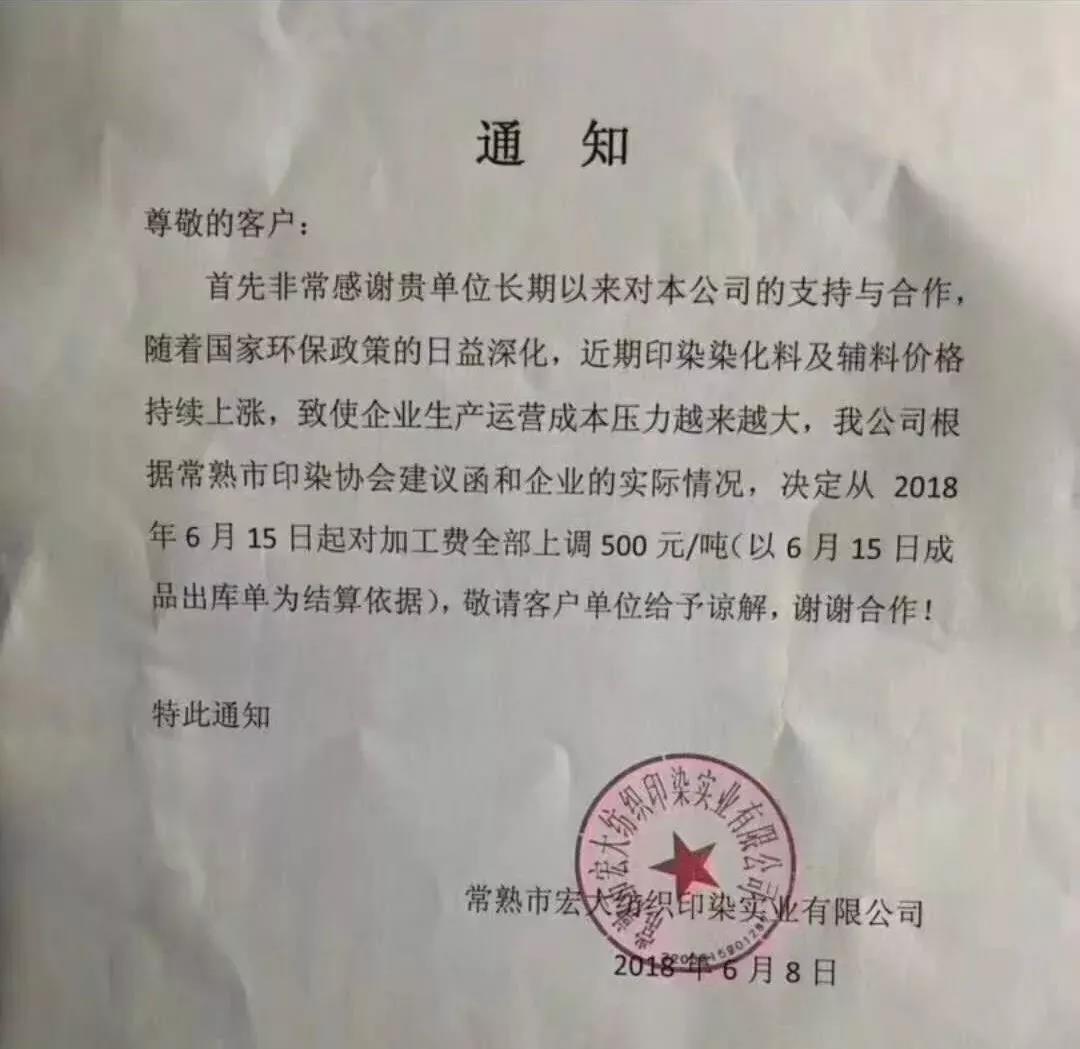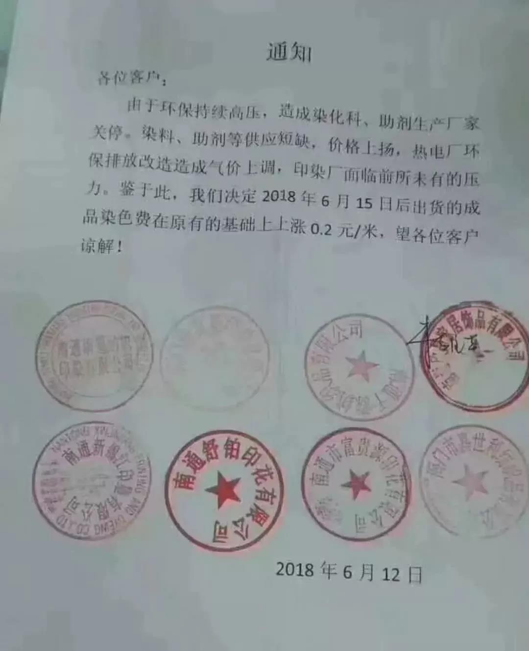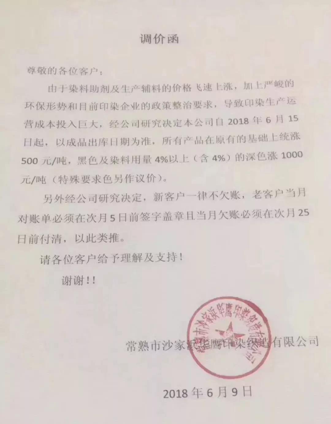 广东佛山、江门10家印染厂再次齐发涨价通知:6月20日起,新报价格将在原有的价格基础上调500元/吨。