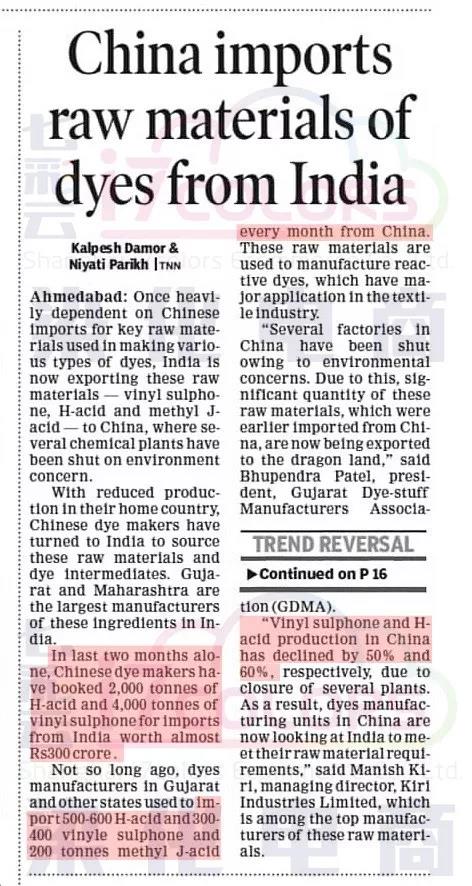 古吉拉特邦染料制造协会(GDMA)主席Bhupendra Patel先生表示:很多中国企业都因涉及到环保问题关停自检,早期从中国进口到印度的产品,现在反向出口至中国。