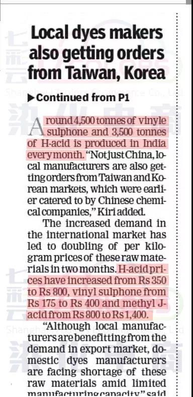 此前,H酸都是从中国向印度出口。因供应趋紧且价格飞涨,国内部分染料生产商已经转而向印度寻货。印度时报的最新消息称,5月以来,中国从印度市场上已经预定了2000吨H酸。印度企业纷纷调高对中国出口H酸的价格,到岸价折合含税价格约从3.3万元上涨到7.5万元,已与国内价格相仿。