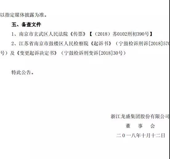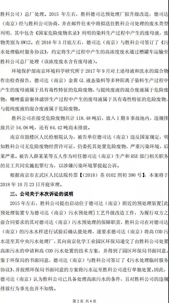 10月12日,浙江龙盛发布公告:其控股子公司德司达(南京)收到南京市玄武区人民法院《传票》、江苏省南京市鼓楼区人民检察院《起诉书》及《变更起诉决定书》,涉嫌污染环境罪。